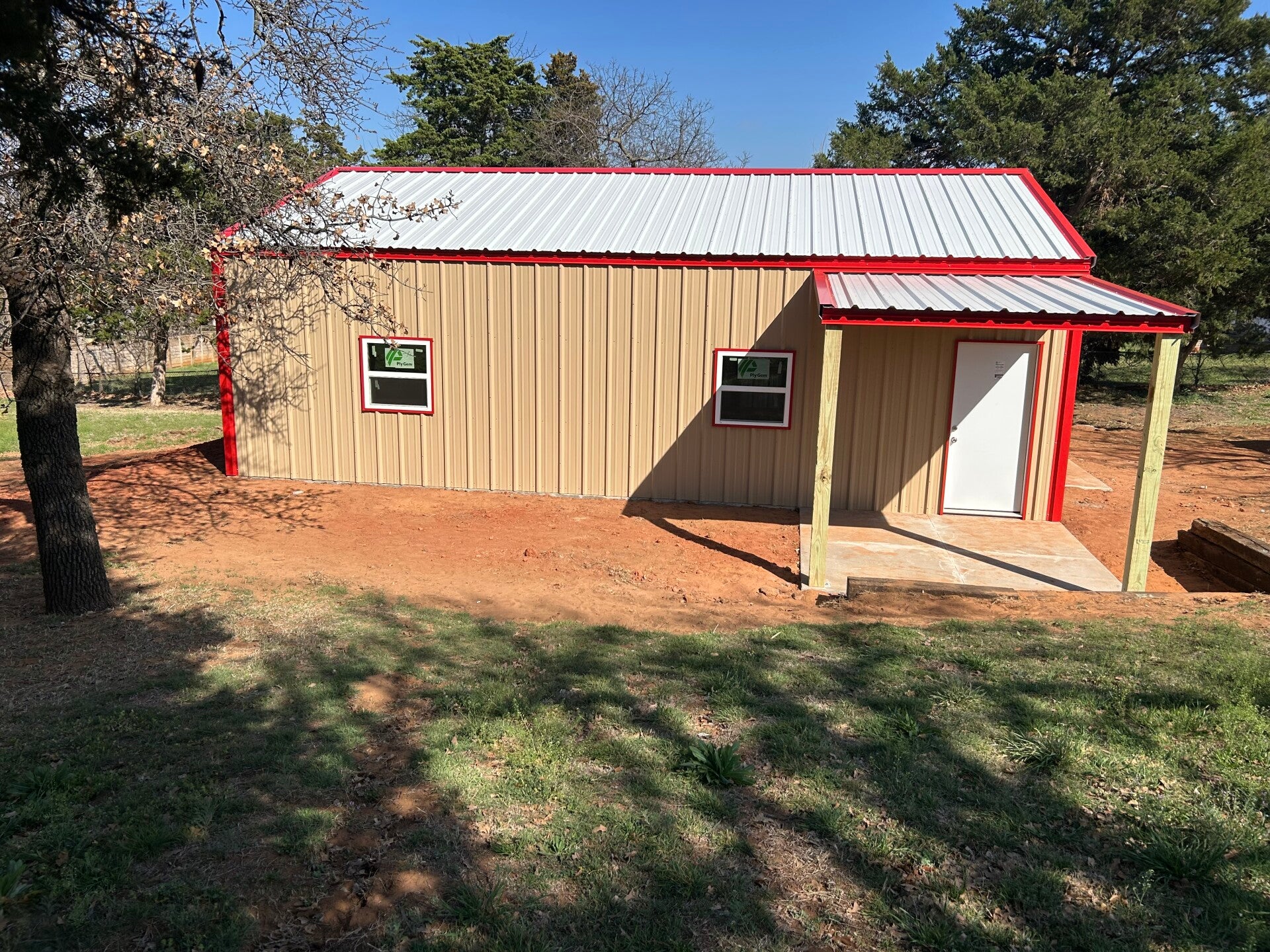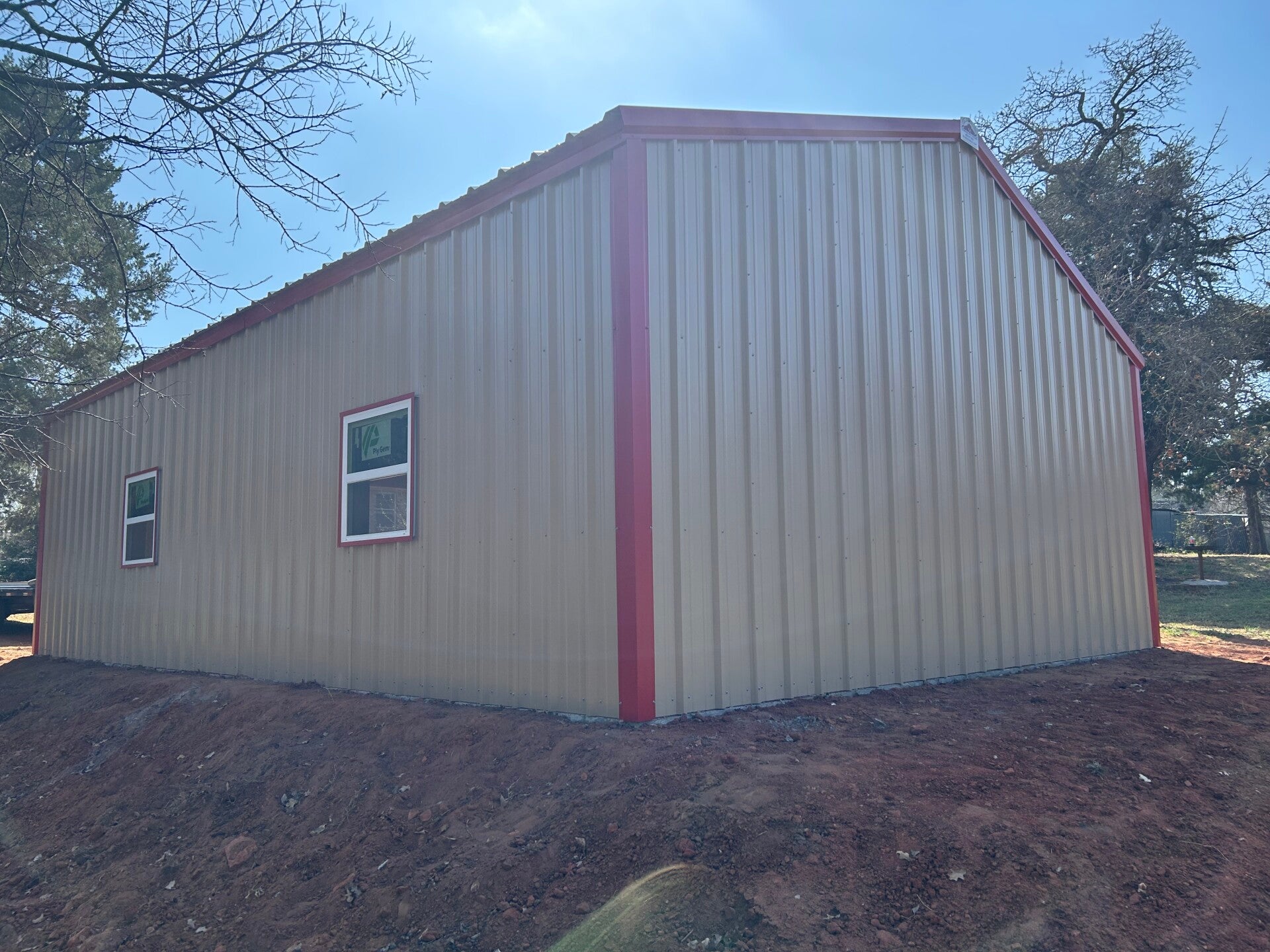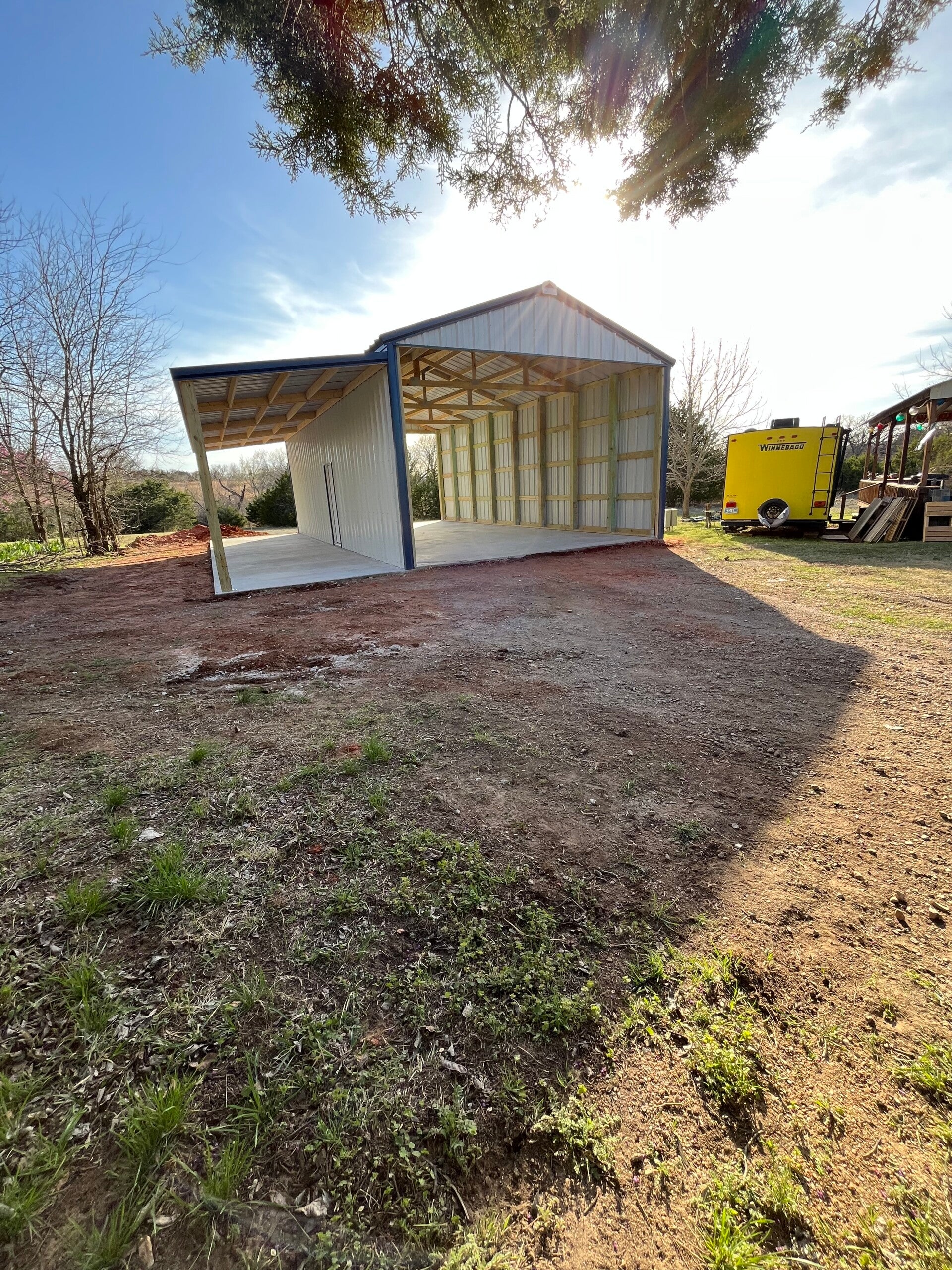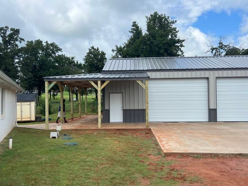 25x30x12 with upgraded color matching screws and a 20x25 gable extension with an enclosed truss and 2ft sheet metal on the sides